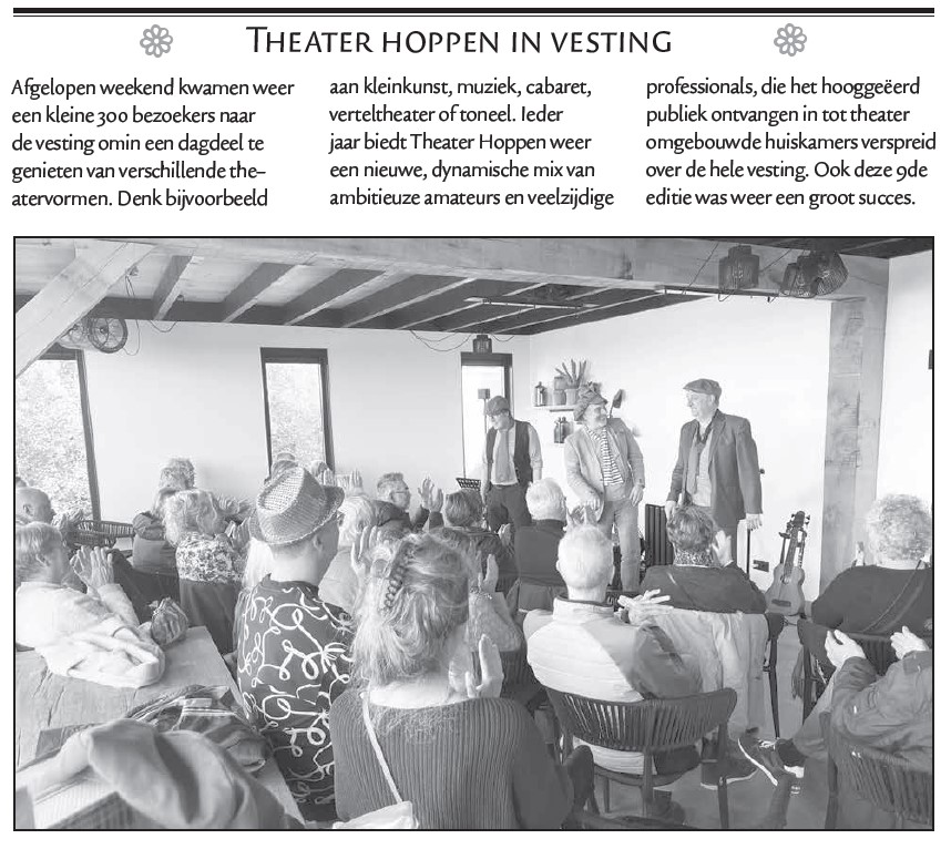 Het recept: in een dagdeel kun je aansluitend genieten van 3 of 4 verschillende theatervormen. Bijvoorbeeld kleinkunst, muziek, cabaret, verteltheater of toneel. Ieder jaar een nieuwe, dynamische mix en bijzondere combi van ambitieuze amateurs en veelzijdige professionals, die je in intieme huiskamer-settings laten genieten van diverse theatergenres.